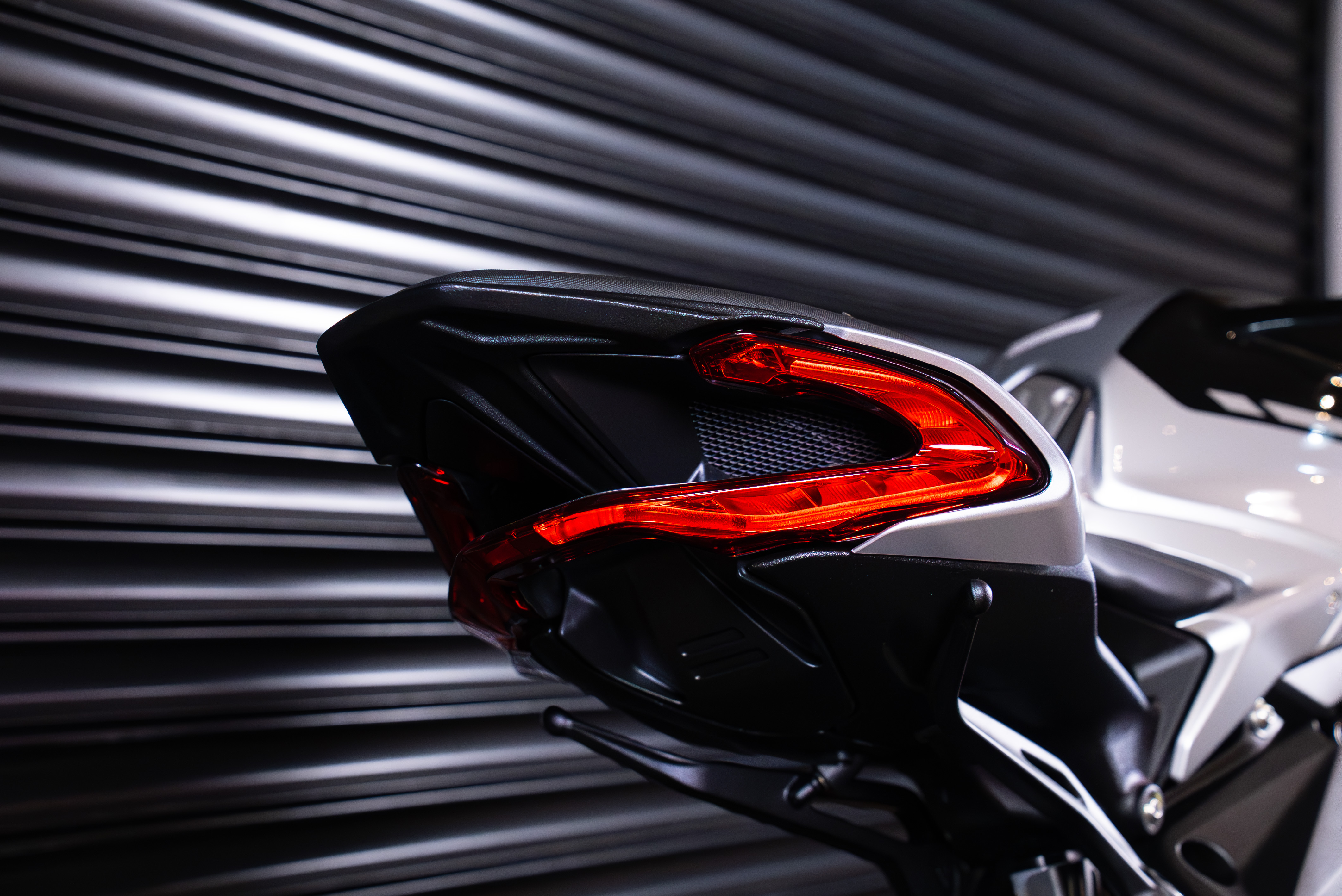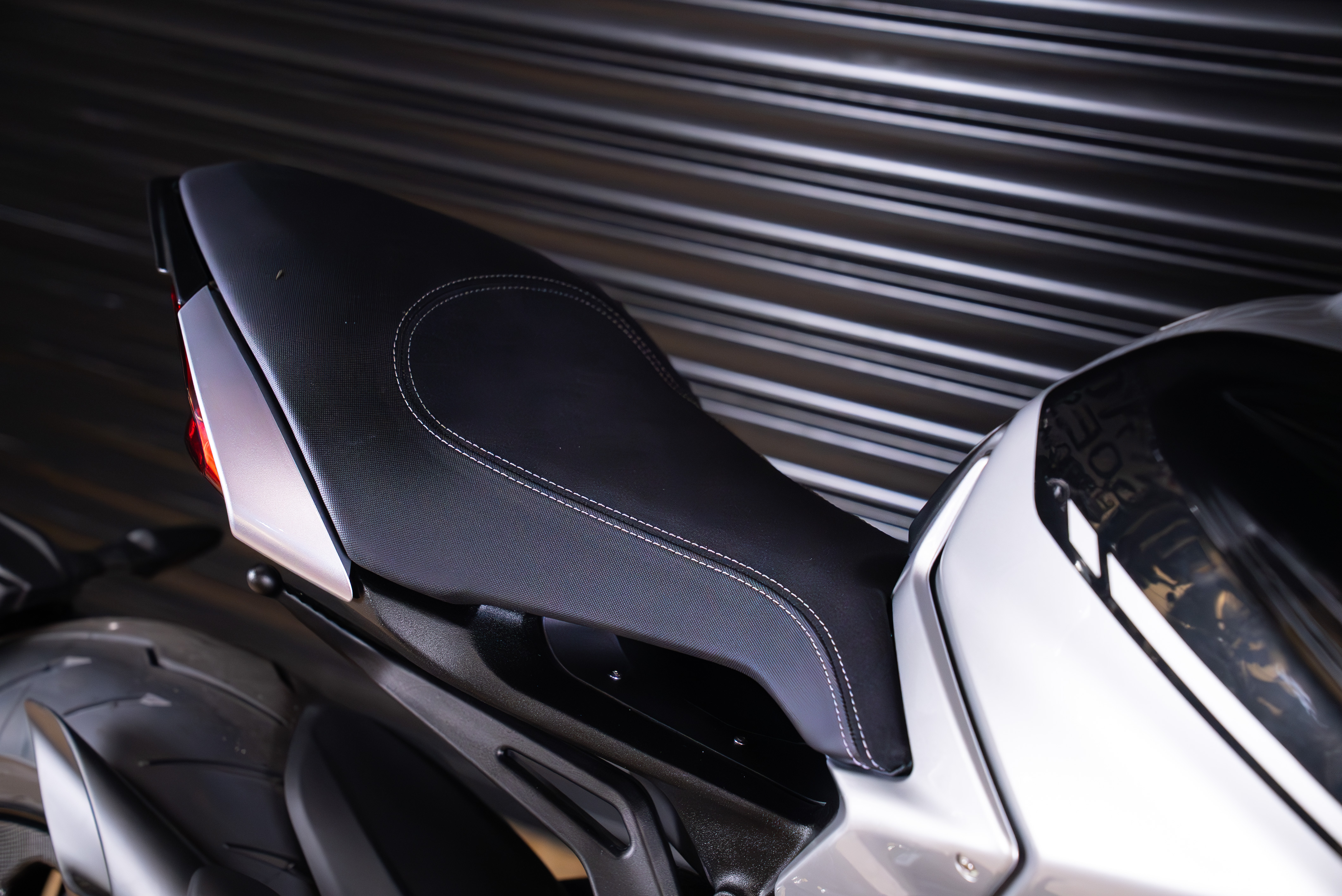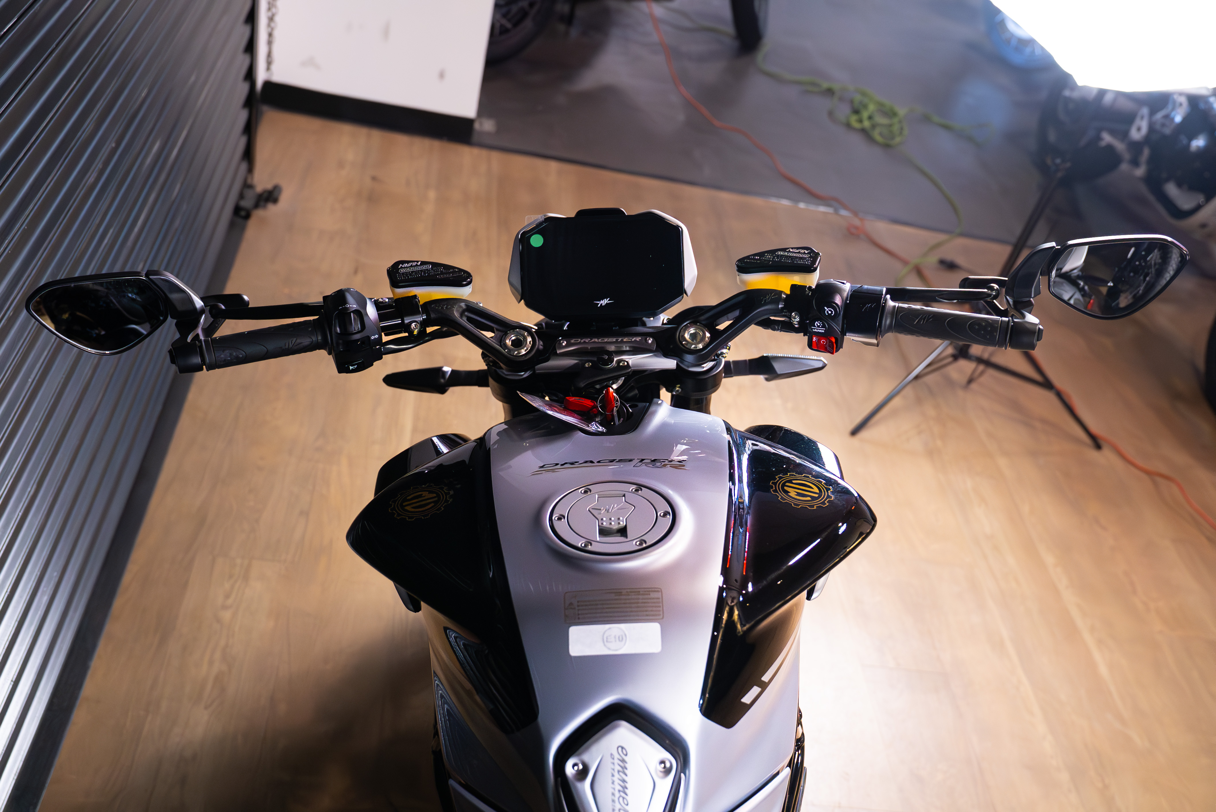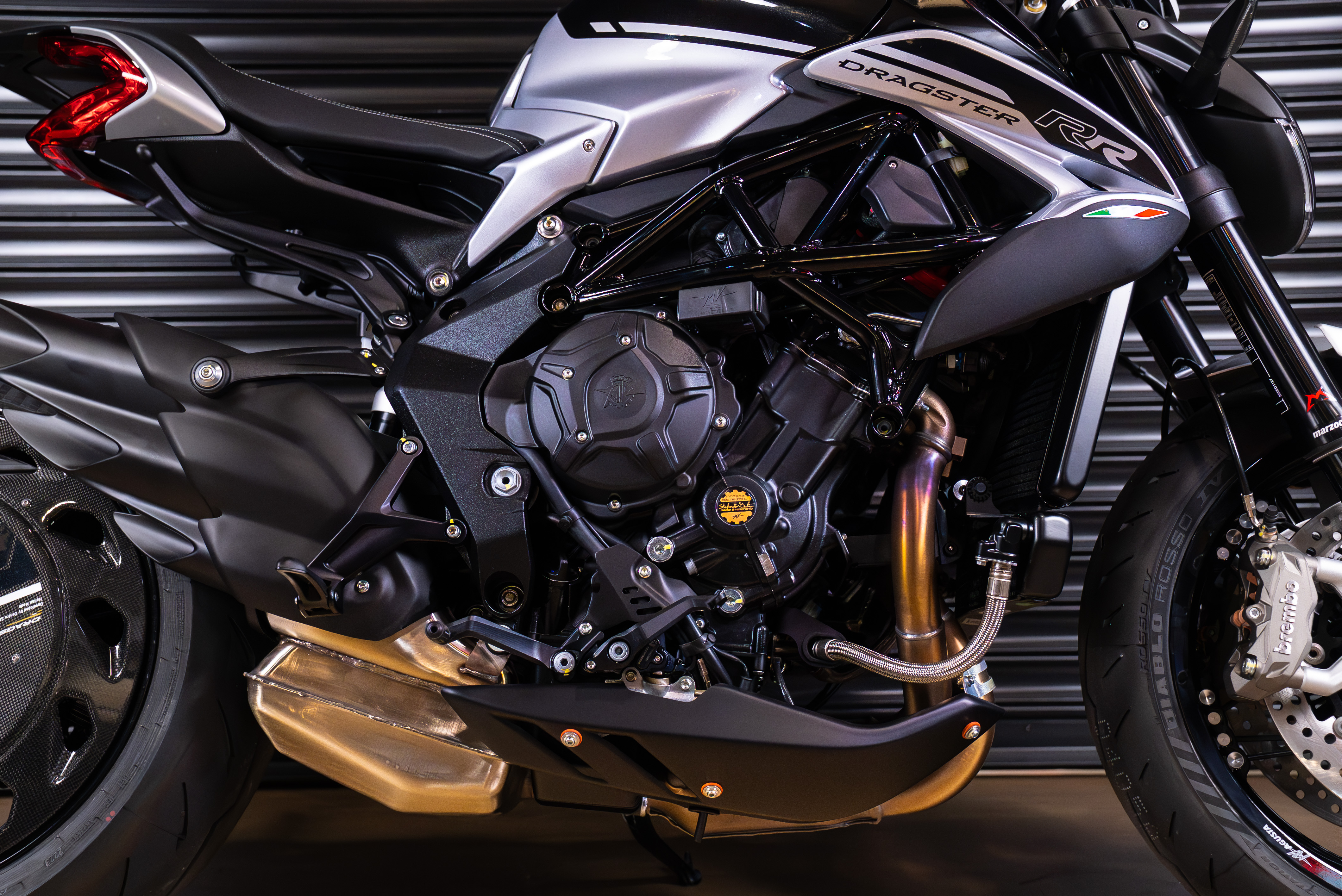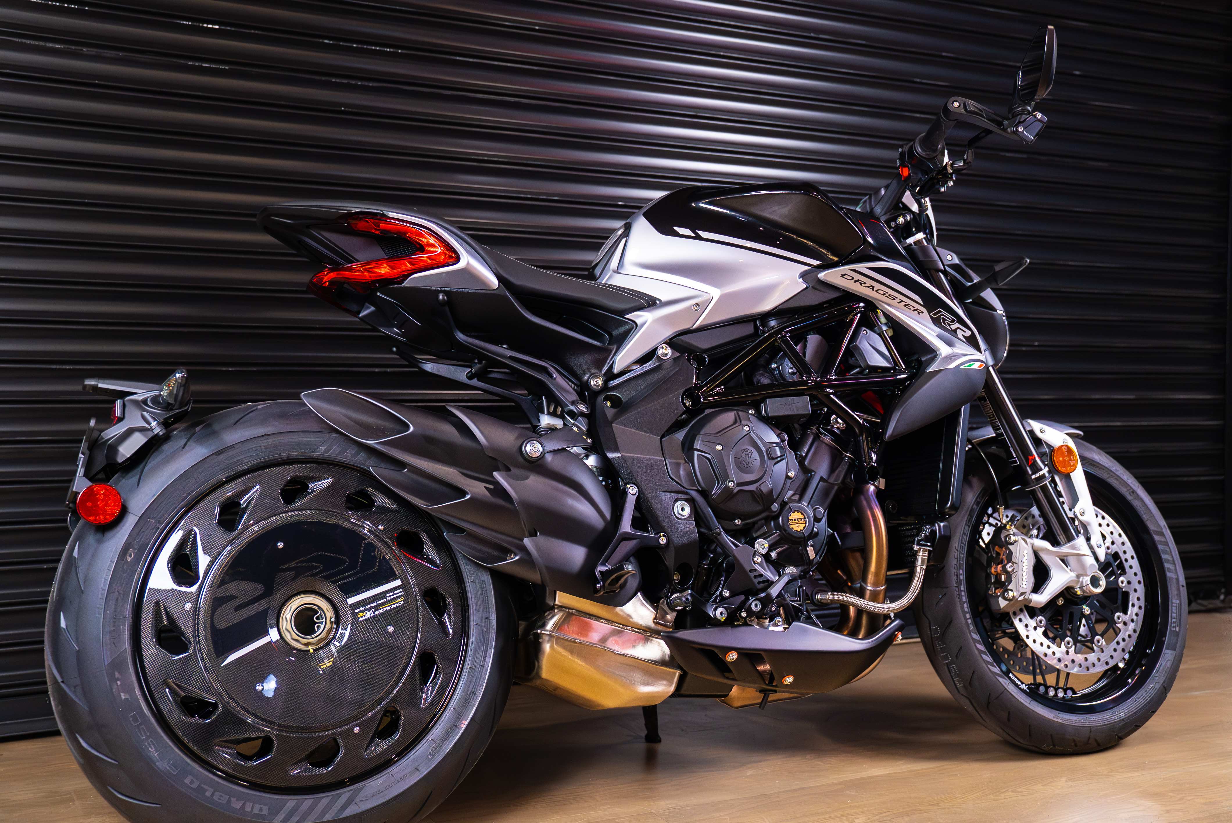 The sculpted contours of the fuel tank, combined with the bold contrast of black and silver, give the DRAGSTER RR OTTANTESIMO a sensual yet vigorous beauty, while the carbon rear wheel cover reflects its unapologetically hooligan spirit. This limited series consists of only 500 units, identifiable by the laser engraving on the triple clamp or tank protection plate, marked "1 di 500," along with the word "EMMEVI," included to clarify the pronunciation of the MV acronym.
